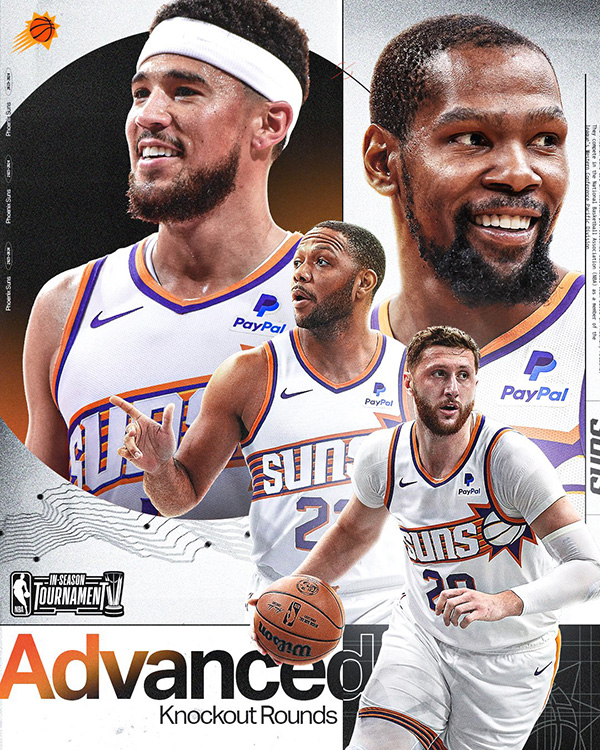 在NBA首届季中锦标赛中,太阳3胜1负排名西部A组第二,净胜分为34分,凭借微弱优势以西部外卡的身份晋级八强;太阳官方第一时间晒海报祝贺球队晋级八强。