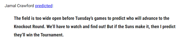 太阳晋级八强,NBA名宿贾马尔-克劳福德预测太阳将夺冠,他在节目中表示:在周二的比赛之前,竞争非常开放,所以很难预测哪些球队会晋级淘汰赛。我们只能拭目以待。不过如果太阳晋级淘汰赛,我预测他们会拿下季中锦标赛冠军。”