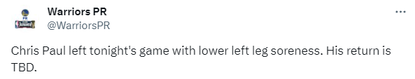 178直播11月29日讯 ,NBA季中赛收官日伤病不断,拉文德罗赞以及康诺顿伤退,在勇士对阵国王比赛中,38岁的保罗不幸遭遇伤病,因伤突然一瘸一拐返回更衣室,勇士官方宣布,保罗左小腿酸痛,本场比赛回归待定。