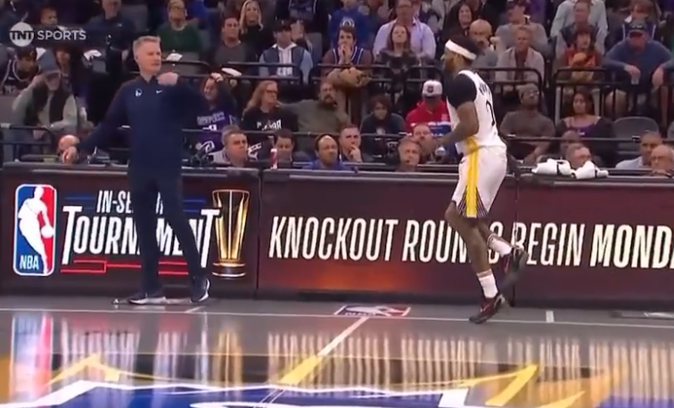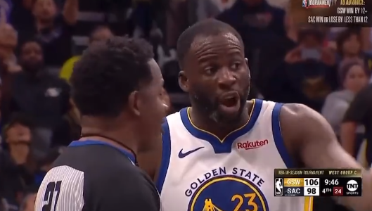 末节,裁判吹罚引争议,格林在防守端被打到面部后痛苦倒地,裁判没有任何吹罚,格林找裁判理论也没用,之后格林模仿蒙克翻腕动作吃到技术犯规,格林的情绪有些失控,见状科尔赶紧换下格林。
