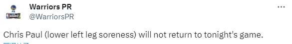 上半场,保罗仅仅只打了4分钟就因伤离场,一瘸一拐返回更衣室,接受检查后勇士官方宣布,保罗因左小腿酸痛退出本场比赛。本场比赛,保罗2投1中拿到3分2抢断,提前伤退。