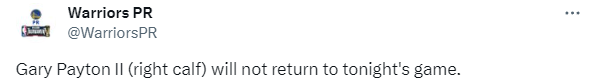 小佩顿替补上场16分钟,4投3中拿到7分5篮板2抢断1助攻1盖帽,在场上的表现十分积极以及拼命,可不幸遭遇伤病,勇士官方宣布,小佩顿因右小腿受伤而退出本场比赛。