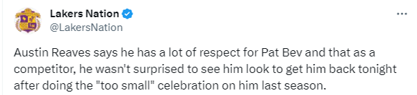 赛后谈到贝弗利,里夫斯表示他非常尊重贝弗利,并且作为一名竞争者,他并不惊讶在上赛季自己对贝弗利做出“太小了”庆祝动作后,贝弗利会在今晚找机会还以颜色。