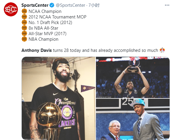 美媒也祝贺浓眉生日快乐,SportsCenter列出浓眉的荣誉——NCAA冠军、12年状元、8次全明星、17年全明星MVP和NBA总冠军,浓眉才28岁就已经完成这么多的成就。