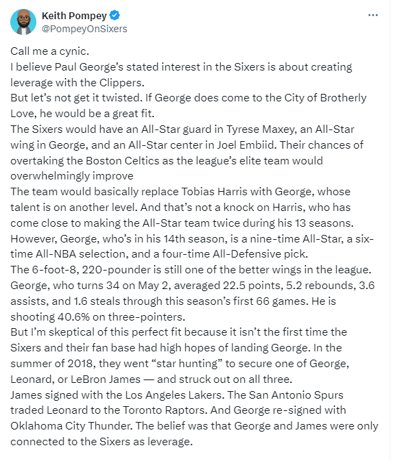 Keith Pompey还表示:我相信保罗-乔治对76人的兴趣是为了建立和快船谈判的筹码;但我们不要曲解它,若乔治真的加盟费城,他将是一个非常合适的人选,76人将拥有马克西、乔治和恩比德,他们超越凯尔特人成为联盟精英球队的机会将大大提高。球队基本上会用乔治取代托拜厄斯-哈里斯,他的天赋在另一个层面上。这并不是对哈里斯的打击,他在13个赛季的生涯中曾两次接近全明星阵容。
