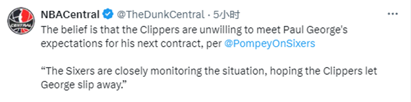 76人记者Keith Pompey分析了76人今夏追求乔治的可能性,他报道称乔治可以在今夏拒绝快船下赛季价值4880万美元的球员选项,成为一名不受限制的自由球员。本赛季他也有资格续约,但双方尚未达成协议。人们相信快船给不到乔治对下一份合同的期望。有报道称快船队的报价低于小卡3年 1.497亿美元的续约合同。