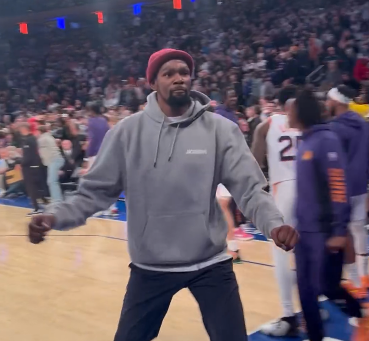 布克绝杀后杜兰特十分兴奋,身穿灰色连帽卫衣、戴着小红帽,一脸发狠的表情,与场边的球迷疯狂击掌庆祝;看到布克制胜一击,杜小帅尽情宣泄内心的喜悦之情。