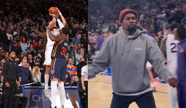 太阳和尼克斯决战到最后一刻,布伦森关键一球扳平比分,太阳关键一攻,沃格尔为布克布置了一个绝杀战术,终场前1.7秒,布克迎着两人包夹轰进制胜三分,布克准绝杀点燃替补席;赛后布克更新动态祝贺自己三分绝杀,杜兰特疯狂庆祝一幕也随之曝光。