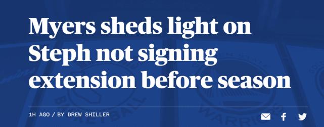 关于库里拒绝续约的问题,总经理迈尔斯认为不是什么大事“本赛季结束后,他可以跟我们签一份四年或者五年的合同,这不是什么难事。他只是跟我说‘嘿,让我们在年底再谈吧’,所以这就是他想做的事情。我觉得他目前无论在生活还是职业上都很好。我认为他很乐意待在勇士队,当然我也会问自己‘如果发生了这种事怎么办?’,但这些都是没有事实根据的。所以我(对库里留队)感觉很好,我想他(库里)也感觉很好。”