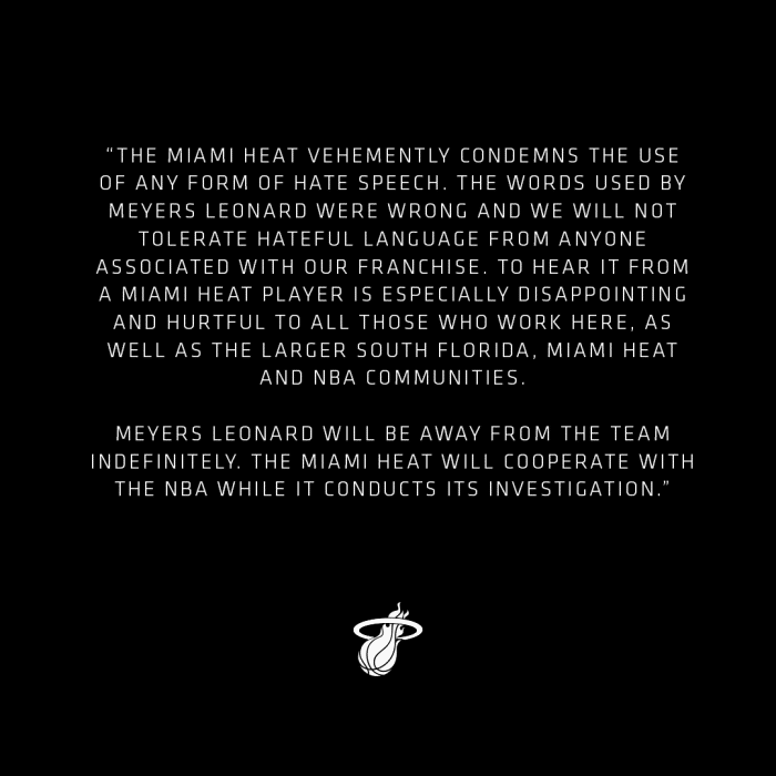 热火在今日早些时候发表声明宣布他无限期休赛“迈阿密热火强烈谴责任何形式的歧视言论。迈耶斯-伦纳德所使用的言语完全是错误的,而我们不会容忍球队中的任何一分子说出歧视性的话语。迈耶斯-伦纳德将会被无限期离开球队,热火队也将协助NBA官方一起调查该事件。”