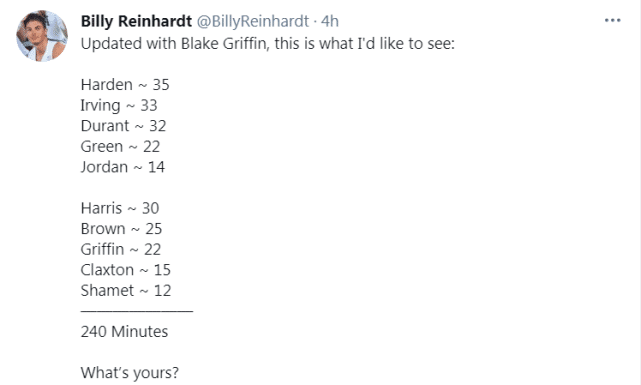 首发:哈登(35分钟)、欧文(33分钟)、杜兰特(32分钟)、格林(22分钟)、小乔丹(14分钟);替补:哈里斯(30分钟)、布朗(25分钟)、格里芬(22分钟)、克拉克斯顿(15分钟)、沙梅特(12分钟)。