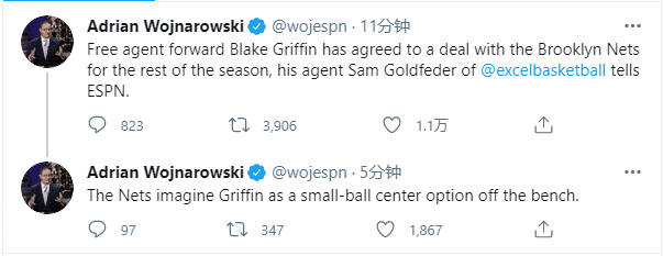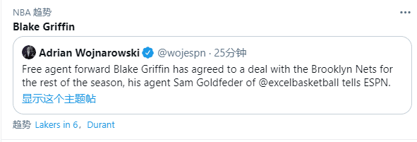 178直播讯 北京时间3月8日,在NBA亚特兰大全明星赛这一天,格里芬下家终于确定下来,先是shams报道篮网预计签约格里芬,然后ESPN名记报道格里芬已经同意签约篮网,格里芬的经纪人证实了这一重磅新闻,目前只差篮网正式官宣。