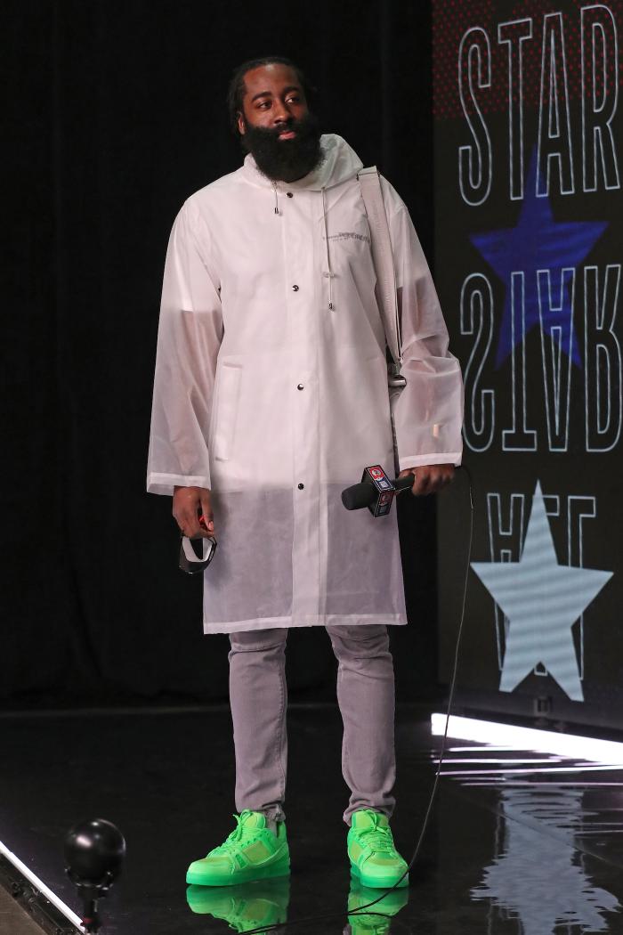 哈登身穿绿色板鞋搭配一件另类外套引热议,亮相接受采访,登哥表示希望不负众望,给球迷们一些特别的东西;等到拍摄定妆照时,哈登双手环抱十分有范。