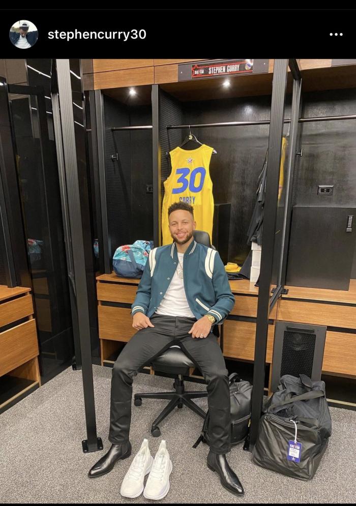 库里穿着一双黑色皮鞋,坐在詹姆斯队更衣室;除了全明星正赛,库里还会参加三分大赛,生涯第7次参加三分 大赛。