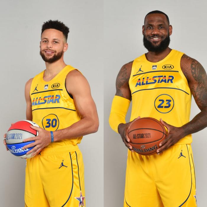 湖人巨星詹姆斯和勇士领袖库里都是身穿黄色球衣,詹姆斯身穿23号战袍出镜,双手抱着印有2021年全明星赛的篮球,满脸笑容露出一嘴大白牙;库里则是身穿30号球衣,同样满脸笑容,双手抱着一个花球;詹姆斯和库里职业生涯首次联手当队友,詹库组合太值得期待。