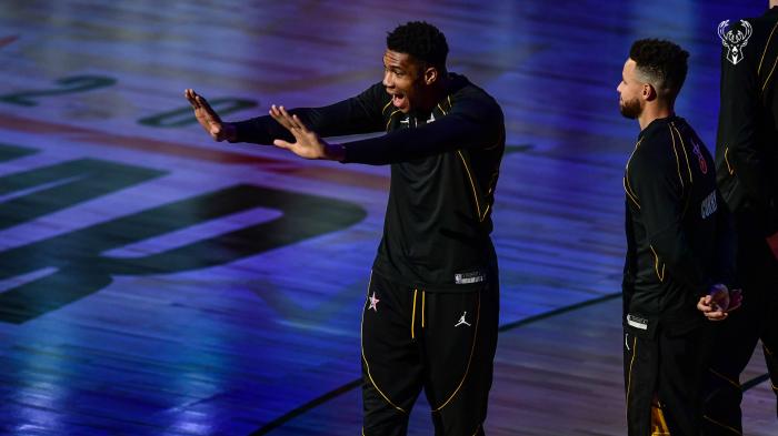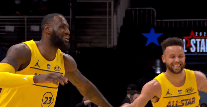 西部队长+全明星队长詹姆斯最后一个亮相,现场DJ把詹姆斯的名字拖得特别长;两队球星都身穿黑色全明星套装亮相后,热身现场同样欢乐多,保罗教布朗单打,字母哥陪儿子一起玩球,等等场面充满爱和兄弟情。