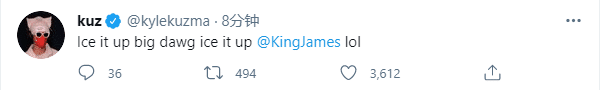 看到詹姆斯放弃首发并且坐在替补席,湖人球员库兹马发推写道:把冰袋绑上吧老铁,把冰袋绑上吧!