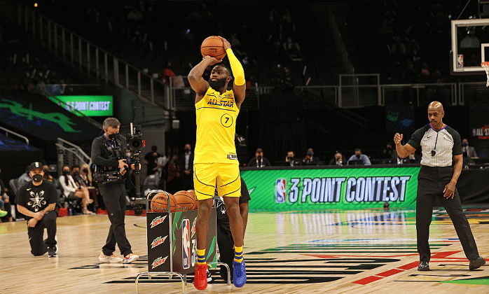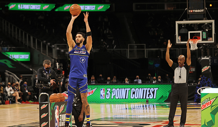 决赛第一个出场的是塔图姆,他的手感一般,只得到了17分;第二个出场的是康利,他的花球和超远不错,最终拿下了27分。