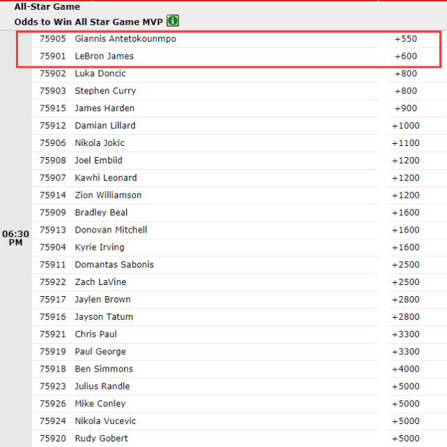 先来看看全明星赛MVP的赔率排名。在全明星队长选人结束后,詹姆斯是当时全明星MVP赔率榜的第一,但现在字母哥已经超越他,成为这一奖项的头号热门。字母哥之前参加过4次全明星赛,场均能得到27.3分,是全明星赛历史场均得分王。如今,他以+550的赔率微幅领先詹姆斯(+600)。