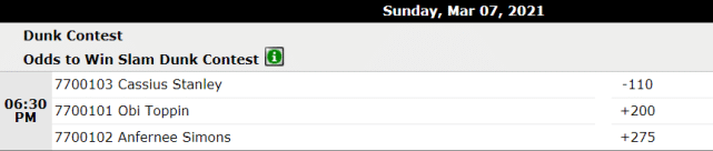 扣篮大赛的赔率变化也不小。两天前最不被看好的步行者小将卡修斯-斯坦利,如今已经是扣篮大赛冠军的头号热门,他的夺冠赔率达到-110,排名第二的球员是尼克斯的托平,开拓者的安芬尼-西蒙斯(+275)位居第三。斯坦利曾在杜克大学打破锡安的弹跳纪录。