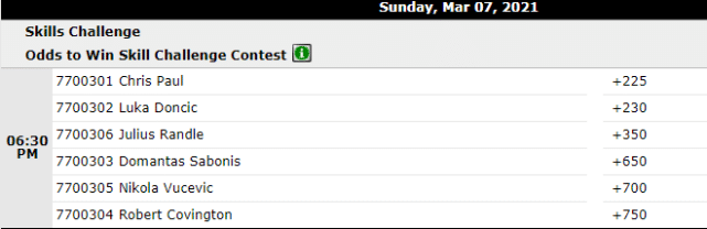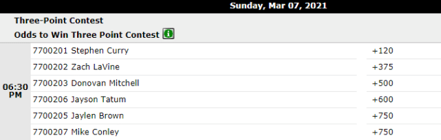 最后是三分大赛。和两天前一样,夺冠赔率领跑的依然是库里(+120)。从赔率来看,他的优势较大。位居第二至六位的依次是拉文(+375)、米切尔(+500)、塔图姆(+600)、布朗(+750)和康利(+750)。顶替布克参赛的老将康利,和布朗一起并列在三分夺冠赔率榜的最后一位。