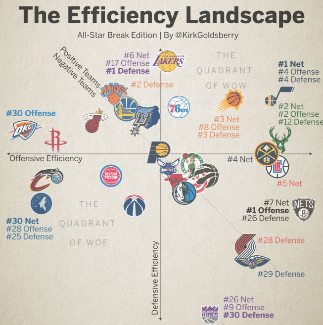 178直播3月7日讯 NBA全明星赛在即,进入到全明星正赛和单项赛的球员要陆续去到比赛地,而没有入选到全明星的球员们则是在密集赛程下有了难得的休息时间。目前常规赛已经进行到一半,各队在全明星前的攻防效率值也已经出炉。