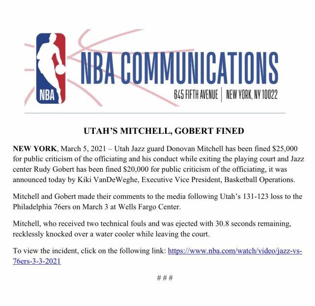 虽然裁判表现不佳,但联盟一向禁止球员在赛后公开批评裁判,米切尔和戈贝尔的这两张罚单也在意料之中。