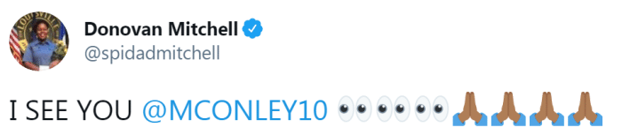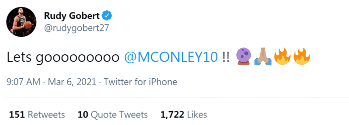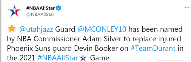 由于布克原来在杜兰特队,所以康利也就自然加入杜兰特队。他将和爵士队友米切尔同队,而另一位爵士球星戈贝尔在詹姆斯队。戈贝尔和米切尔都第一时间恭喜了康利。