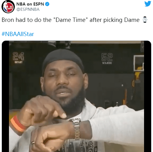 而在选替补时,詹姆斯依然给他们中的大部分都送上了外号。首先选择中的利拉德,他指了指自己的手表,表示要选“利拉德时间”。随后是西蒙斯,西蒙斯的外号很有趣——每回合都努力打球先生。再是保罗,詹姆斯送给老朋友“控卫之神”的美誉。之后是杰伦布朗,杰伦·被低估的·布朗。再是PG13保罗乔治,以及大个子萨博尼斯。