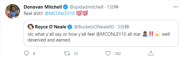 米切尔先是发推写道:我看到你了,康利;戈贝尔则是直言让我们一起加油,随后爵士球员奥尼尔发推写道:不管别人怎么说或者什么感觉,康利当之无愧;米切尔评论奥尼尔动态:事实100%。