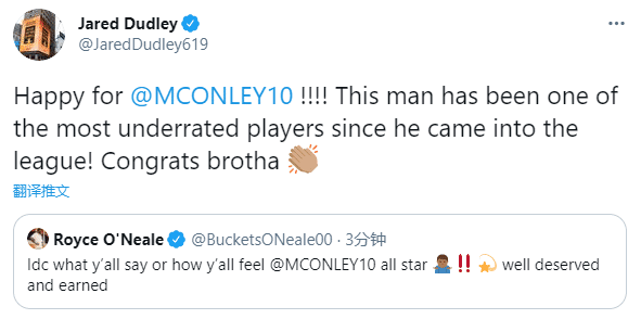 湖人球员杜德利也恭喜康利:为康利感到开心,自从他加入联盟以来,他一直是最被低估的球员之一!恭喜你,我的兄弟。