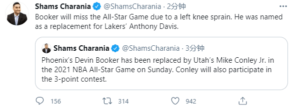 178直播讯 北京时间3月6日,爵士球星迈克-康利被邀请参加全明星引热议,苦等14年终于成为全明星,职业生涯首次入选全明星;据名记shams报道,康利是顶替布克入选全明星替补阵容,布克伤情确诊为左膝扭伤,从而无法参赛,此前布克是顶替浓眉入选的;随后NBA官宣这一消息。