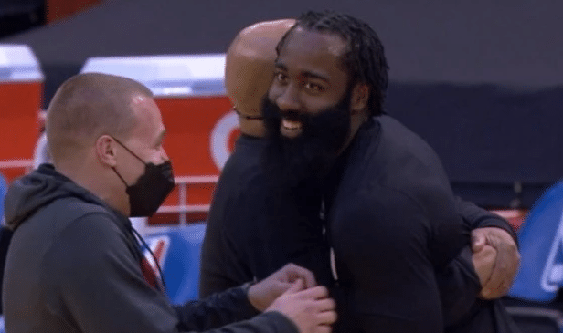 记者插话问及是不是回到了熟悉的地方,篮板和球馆都熟悉,哈登表示:我对于他们很熟悉,所以一切都变得很自然。