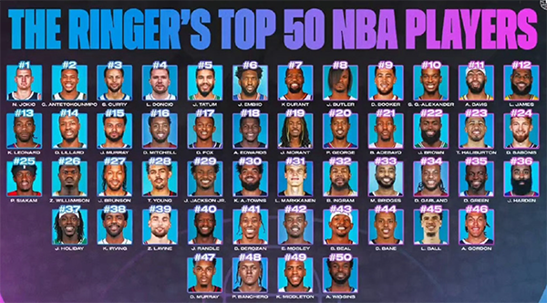 这是《The Ringer》评现役50大球星,约基奇排名第一,字母哥位居第二,勇士核心库里第三,太阳的杜兰特排名第七,詹姆斯第12。不少球迷表示这就很离谱了,詹姆斯虽然年龄比较大,但从本赛季的整体表现、实力和人气来说,都应该是更加靠前的,没想到居然连前十都没有被评选上,足以看出有多么不公平,而且还给本赛季表现不俗的欧文放在第38,落后追梦格林和哈登。