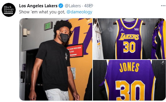 178直播2月27日讯 北京时间2月27日,湖人新援达米安-琼斯正式亮相,湖人官推晒出琼斯走进球馆的画面,并且湖人官宣琼斯将在湖人身穿30号战袍;此前他和湖人签下一份10天短合同,不过今天对阵开拓者,琼斯不太可能上场。