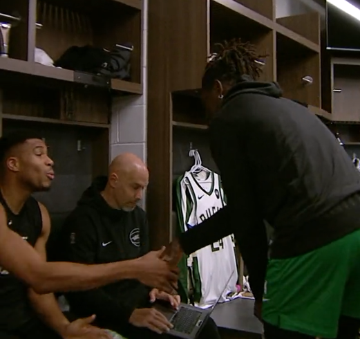在雄鹿更衣室中,霍勒迪身穿凯尔特人球裤和连帽卫衣来到雄鹿更衣室,与大洛佩兹、教练组拥抱寒暄,之后霍勒迪走到字母哥身前,与昔日老搭档握手,字母的表情略显尴尬,不过字母还调皮地拍了一下前队友;霍勒迪与米德尔顿、比斯利拥抱后离开雄鹿更衣室。
