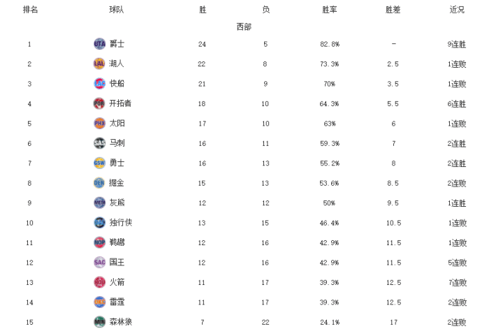 爵士昨天击败了快船之后豪取9连胜,他们在米切尔和戈贝尔的带领下统治西部。湖人今天输给了篮网,施罗德和浓眉哥都无法出战,詹姆斯成为了NBA历史最年轻的35000分先生。快船昨天在没有卡椒组合的情况下输给了爵士,不过泰伦卢的球队整体性还是不错的。开拓者近期一波6连胜强势杀入到前四名,可惜利拉德无缘全明星首发。太阳战绩是17胜10负,整体表现也很不错。马刺近期取得了2连胜,他们成为不少球迷们眼中的惊喜。勇士昨天大逆转赢球之后也升至西部第七名。掘金的约基奇独木难支,近期吃到2连败。