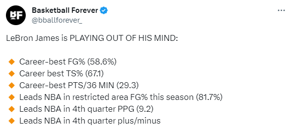 詹姆斯每36分钟能够拿到29.3分,也创生涯最好纪录,美媒直呼勒布朗正在疯狂地打比赛。