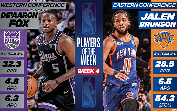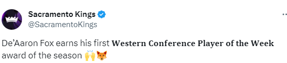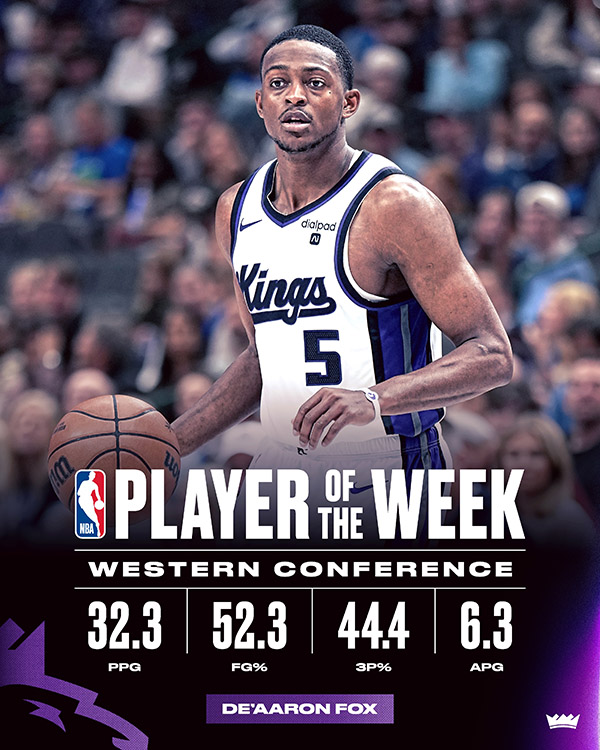 福克斯是目前联盟唯一一位场均至少30分且2次抢断的球员,凭借出色的表现,福克斯赛季首次夺得西部周最佳,生涯第4次获此奖项,国王官方祝贺小狐狸。
