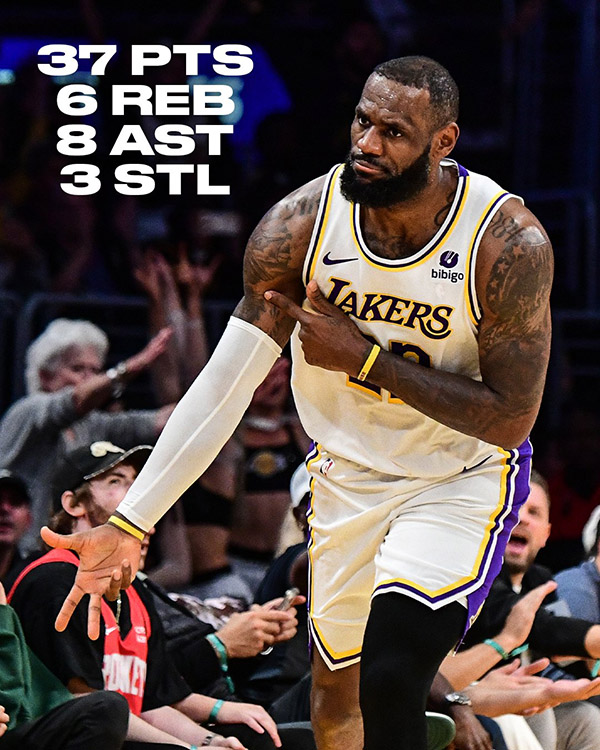 詹姆斯湖人生涯已经109场单场得分30+。职业生涯237场得分35+,超越科比的236场升至历史第三位,仅次于张伯伦(381场)和乔丹(333场)。