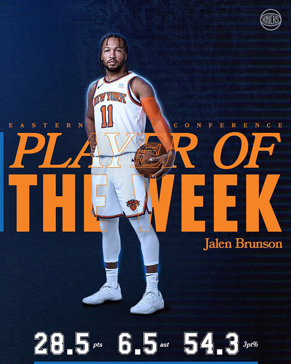 布伦森赛季首次夺得东部周最佳,生涯第二次获此奖项,尼克斯官方第一时间祝贺布伦森;目前尼克斯8胜5负,排在东部第6位。