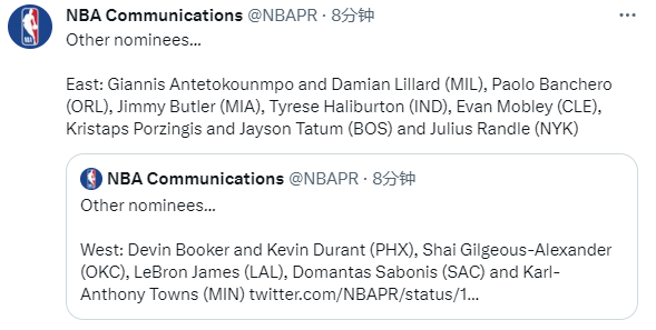 东部:字母哥、利拉德、班凯罗、巴特勒、哈利伯顿、莫布里、波尔津吉斯、塔图姆、兰德尔