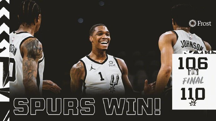 马刺(10-8):阿尔德里奇20分3篮板,德罗赞21分5篮板7助攻,约翰逊18分10篮板,穆雷11分11篮板4助攻,沃克14分,米尔斯12分2篮板,盖伊6分3篮板。
