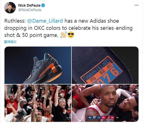 178直播讯 北京时间1月25日,据球鞋记者NickDePaula报道,开拓者后卫达米安-利拉德的阿迪达斯球鞋将推出一款雷霆新配色,纪念自己前年对阵雷霆时绝杀终结系列赛并砍下50分。
