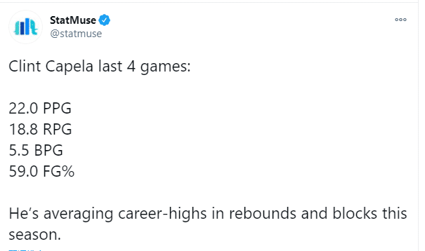 算上今天这一战,卡佩拉过去4场比赛场均可以送出22分18.8板5.5帽且命中率达到59%,赛季打到现在,卡佩拉的场均篮板和盖帽创生涯新高!