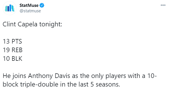 据statmuse统计,卡佩拉成为NBA近5个赛季第二个拿到盖帽三双的球员,另一位是湖人巨星浓眉哥。