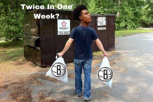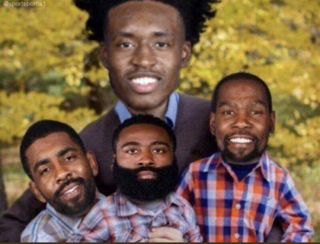 骑士再胜篮网赛后,一张PS的塞克斯顿丢垃圾图火了。图上,塞克斯顿提着两包垃圾,而垃圾上是篮网的队标,配文写道:一周两次?另外,还有球迷PS了塞克斯顿怀抱三个小孩的图片,而三个小孩的头像分别是杜兰特、哈登和欧文。