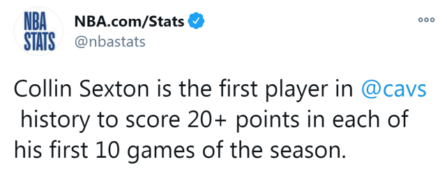 算上这场比赛,塞克斯顿在赛季开季的前10场比赛都拿到了至少20+的得分,成为队史上第一位做到这一点的球员,强如詹姆斯和欧文都没在效力骑士期间做到过。这只是塞克斯顿的生涯第三季,但他已经让不少人刮目相看。名嘴比尔-西蒙斯甚至认为他比国王的福克斯、老鹰的特雷-杨拥有更美好的未来。