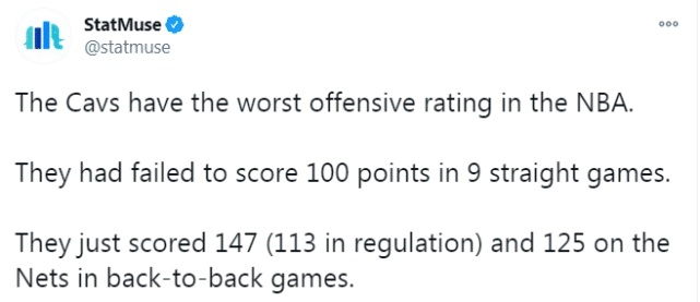 篮网确实被骑士好好地上了一课。骑士是NBA进攻效率最差的球队,在和篮网交锋前,他们连续9场比赛得分不到100分,而这两场比赛呢?一场双加时轰下147分(常规时段113分),另一场轰下125分,篮网的防守问题真不小。