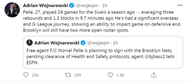 178直播讯 北京时间1月23日,据ESPN记者沃纳罗斯基报道,篮网计划和27岁中锋诺威尔-佩莱签约。根据联盟的健康与安全协议,佩莱需要先通过规定的检测和隔离期,才能正式加盟球队。